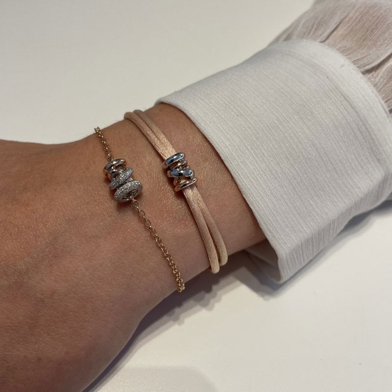 Armband met een satijnen koordje naar keuze. Deze rosébicolor rondelle is zonder diamant. De rondel is ook mogelijk te dragen als hanger aan een collier. Als het koordje versleten is, dan vervangen wij deze onder service. Kies je favoriete kleur op de Katinka Berretty Kleurkaart bij de afbeeldingen en geef in het opmerkingenveld bij het afrekenen door welke kleur je wil.