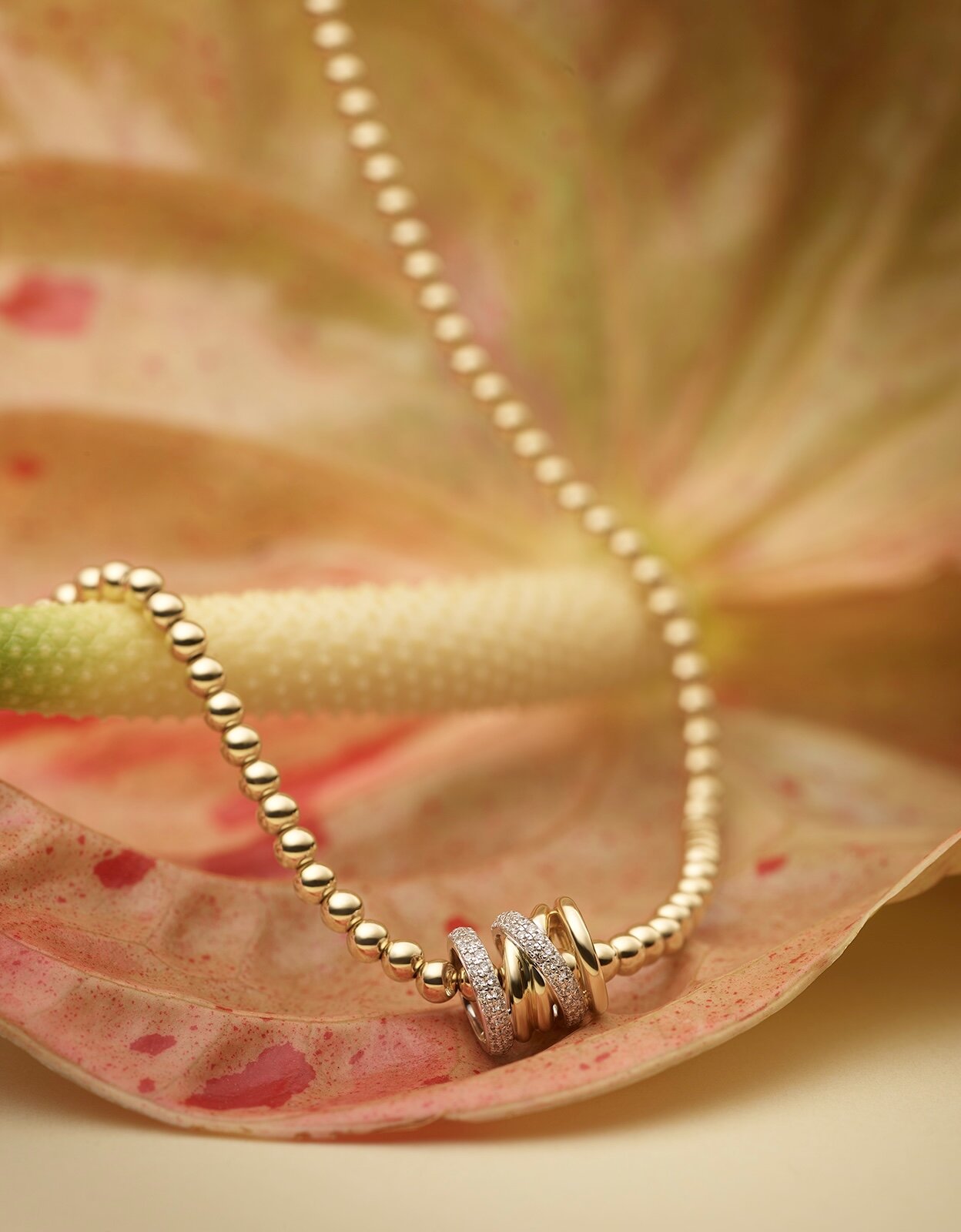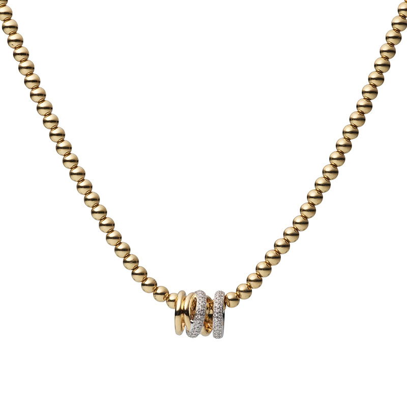 Dit luxe geelgouden bolletjes collier heeft een gouden binnen collier. De bicolor rondelle van dit collier is den medium maat en is gezet met 0.43ct diamant. Kwaliteit TW/SI. Door middel van tussenoogjes is dit halssieraad te dragen op 40cm, 42cm en 45cm. Op verzoek is het mogelijk dit collier op een andere lengte te leveren.