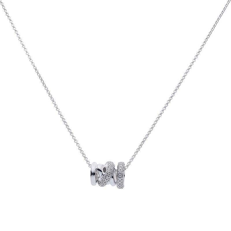 Een collier met een sierlijke ronde witgouden hanger/rondelle met 0,39ct flonkerende briljant geslepen diamanten. Kwaliteit TW/SI.  Dit sieraad is te dragen op 40cm, 42cm en 45cm door middel van tussenoogjes in het collier.