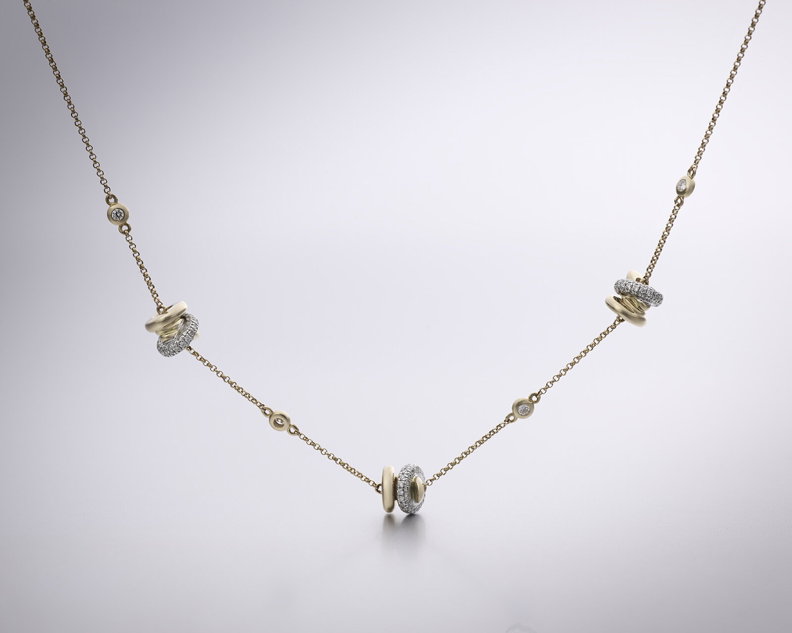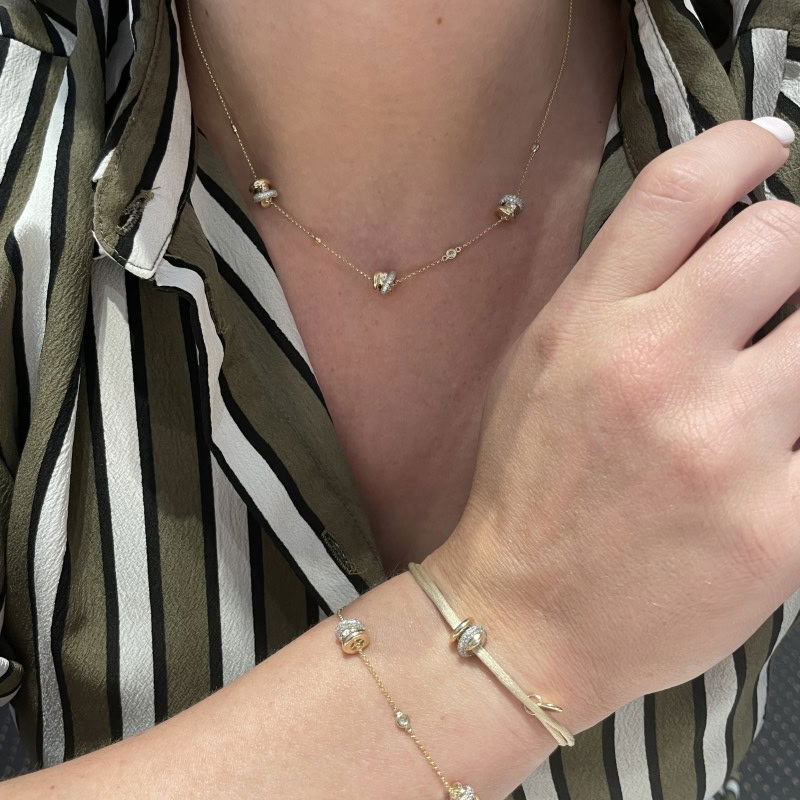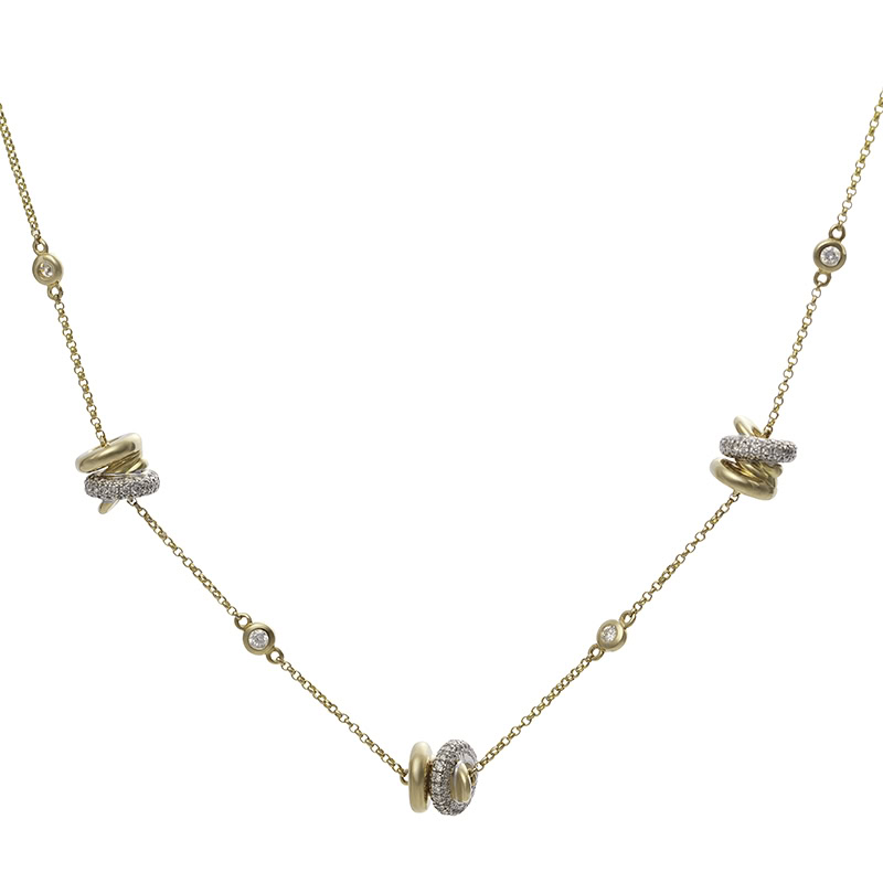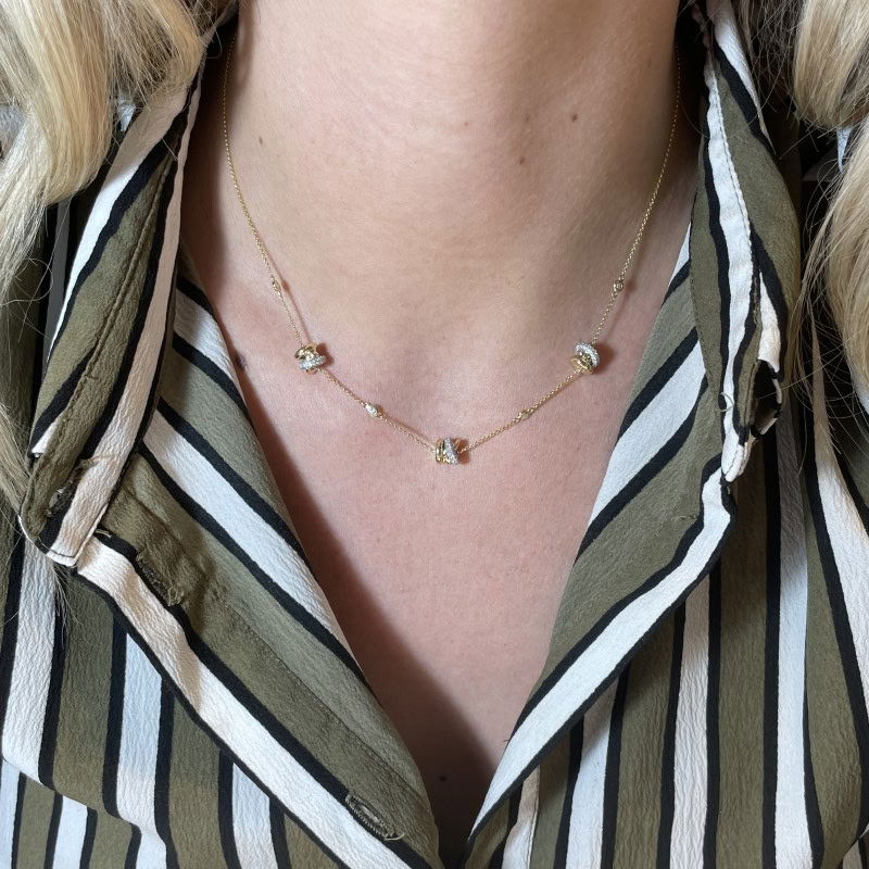 Dit verfijnde collier is voorzien van drie kenmerkende rondelle en vier glad omzette briljant geslepen diamanten. Het halssieraad heeft een diamantgewicht van 0.69ct, kwaliteit TW/SI. Dit sieraad is te dragen op 42cm en 45cm door middel van tussenoogjes in het collier. Ook mogelijk in roségoud en witgoud. Neem contact met ons op voor meer informatie.