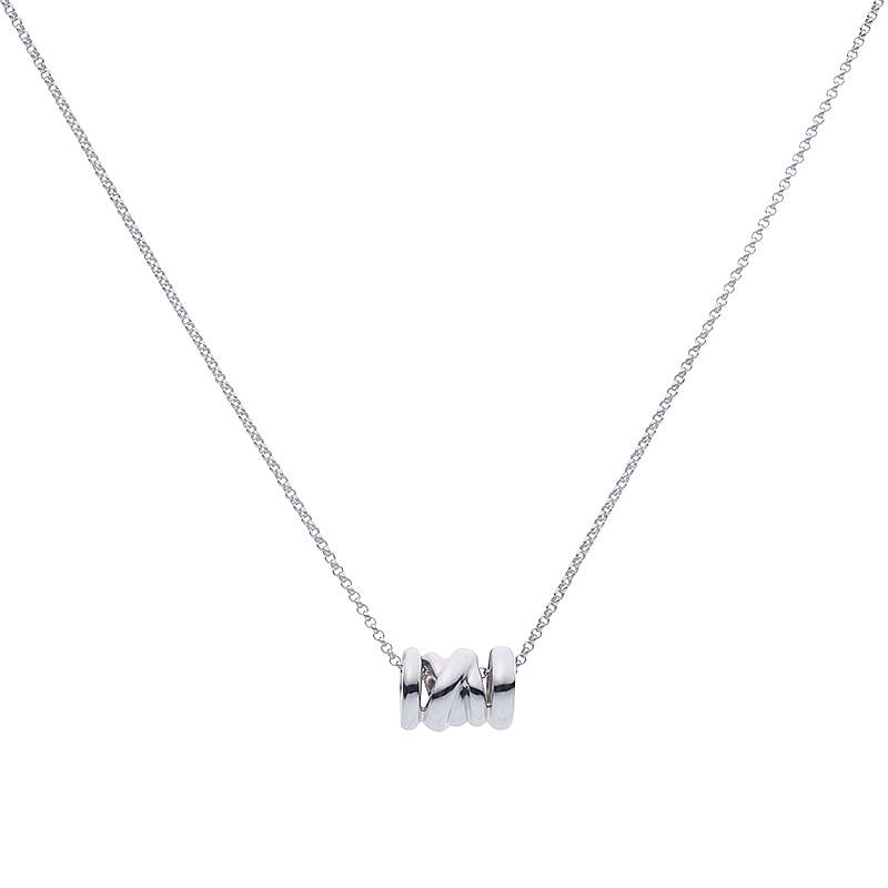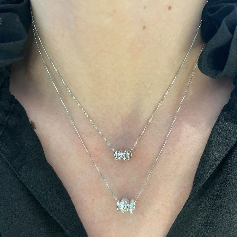 Een collier met een stoere, maar tegelijkertijd elegante witgouden hanger/rondelle zonder diamant. Dit sieraad is te dragen op 40cm, 42cm en 45cm door middel van tussenoogjes in het collier.
