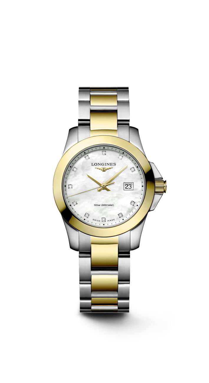 De Longines Conquest L3.376.3.87.7 is een elegant horloge dat sportieve verfijning uitstraalt. Het beschikt over een quartz uurwerk. De roestvrijstalen kast heeft een diameter van 29,5 mm en is voorzien van een unidirectioneel draaiende bezel, krasbestendig saffierglas met antireflecterende coating aan de onderzijde, en een geschroefde kroon. De witte parelmoeren wijzerplaat is bezet met 11 diamanten (totaal 0,036 karaat) en heeft vergulde wijzers. Het horloge is waterdicht tot 30 bar (300 meter) en wordt geleverd met een roestvrijstalen band met gele PVD-coating en een drievoudige vouwsluiting met drukknoppen. Dit model combineert stijl met functionaliteit, ideaal voor dagelijks gebruik en watersportactiviteiten. Refnr:L3.376.3.87.7