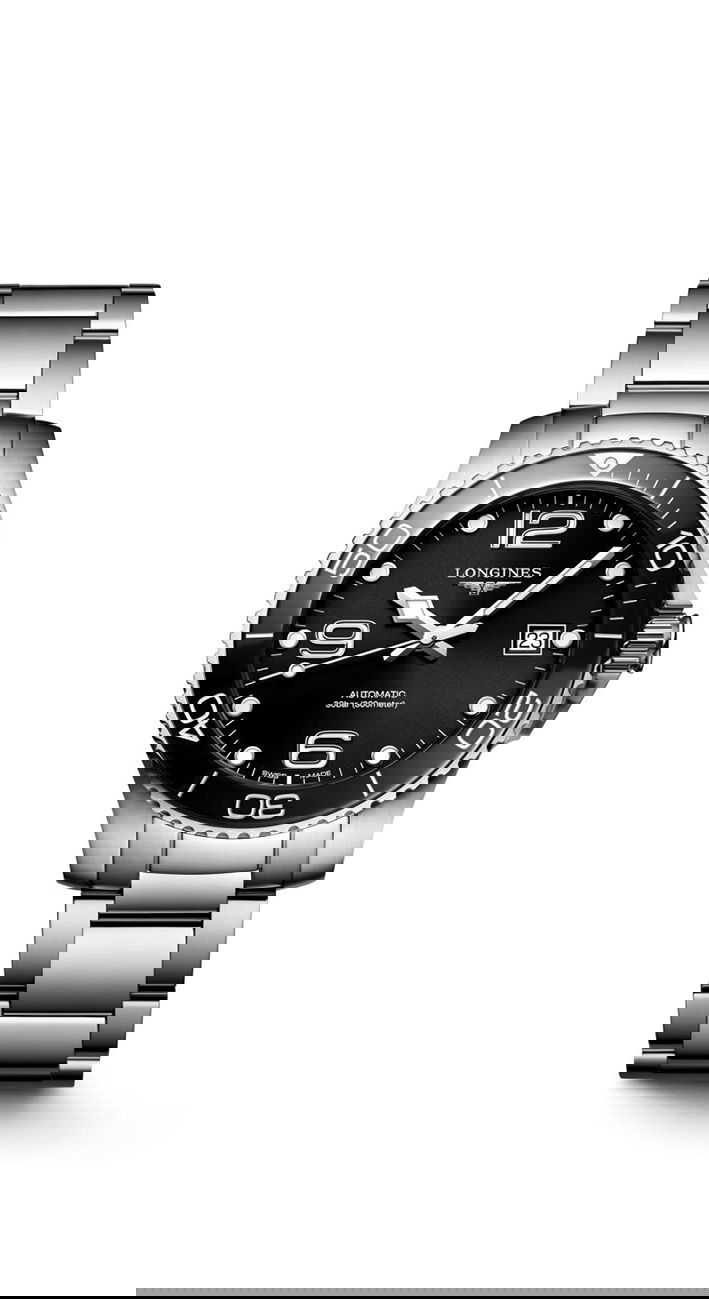 De Longines HydroConquest L3.780.4.56.6 is een sportief en stijlvol herenhorloge met een kastdiameter van 39 mm, vervaardigd uit roestvrij staal en voorzien van een zwarte keramische duikring. Het horloge is uitgerust met een automatisch uurwerk (kaliber L888.5) met een gangreserve van 72 uur en een balansveer van monokristallijn silicium voor verhoogde precisie. De zwarte sunray-wijzerplaat is voorzien van opgezette Arabische cijfers en indexen, evenals verzilverde gepolijste wijzers met Super-LumiNova voor optimale leesbaarheid. Het horloge is waterdicht tot 30 bar (300 meter) en beschikt over een unidirectionele draaibare bezel en een geschroefde kroon. Het wordt geleverd met een roestvrijstalen band met dubbele vouwsluiting. Dit model combineert robuuste functionaliteit met een verfijnde uitstraling, ideaal voor zowel onderwateractiviteiten als dagelijks gebruik.