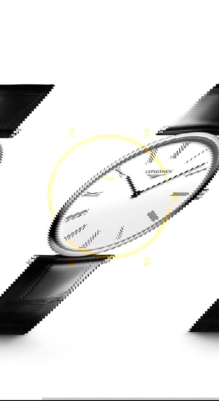 De Longines La Grande Classique L4.755.2.11.2 is een verfijnd dames‑/unisex horloge met prachtige klassieke elegantie. Het Zwitserse quartz uurwerk drijft de uren en minuten aan. De ronde kast van 36 mm heeft een slank profiel met een dikte van 5,2 mm en is voorzien van krasbestendig saffierglas. De witte wijzerplaat toont zwarte Romeinse cijfers en zwarte wijzers, omlijst door een bezel met gele PVD‑coating. De klassieke zwarte alligatorlederen band met gesp sluit harmonieus aan. Dit minimalistische, tijdloze ontwerp is waterdicht tot 3 bar.