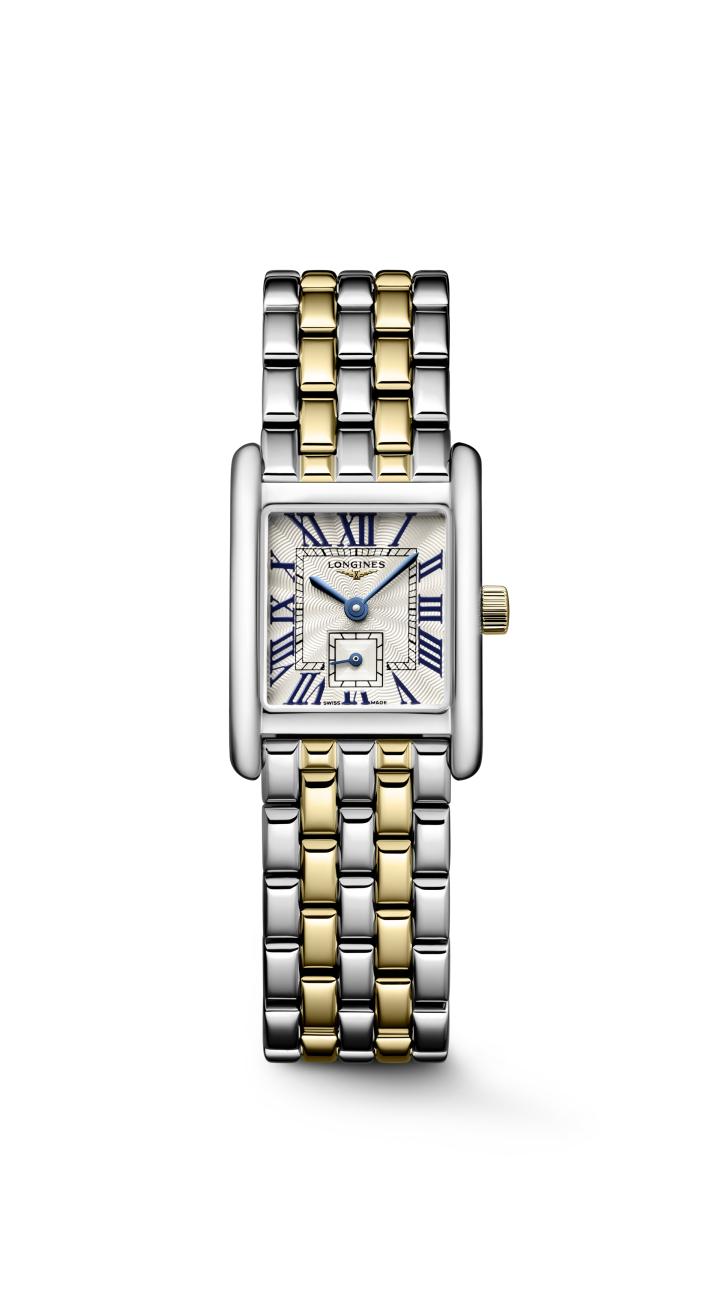 De Longines Mini DolceVita L5.200.5.70.7 is een elegant dameshorloge met een verfijnd en klassiek ontwerp. Het horloge is voorzien van een Zwitsers quartz uurwerk met uren, minuten en een kleine seconde op 6 uur. De rechthoekige kast is uitgevoerd in staal met details in 18 karaats geelgoud en wordt beschermd door krasbestendig saffierglas met dubbele antireflectie. De zilverkleurige wijzerplaat heeft een fijn gegraveerd motief, Romeinse cijfers en geblauwd stalen wijzers. De tweekleurige stalen band met vouwsluiting sluit perfect aan en maakt het horloge compleet. Waterdicht tot 3 bar.