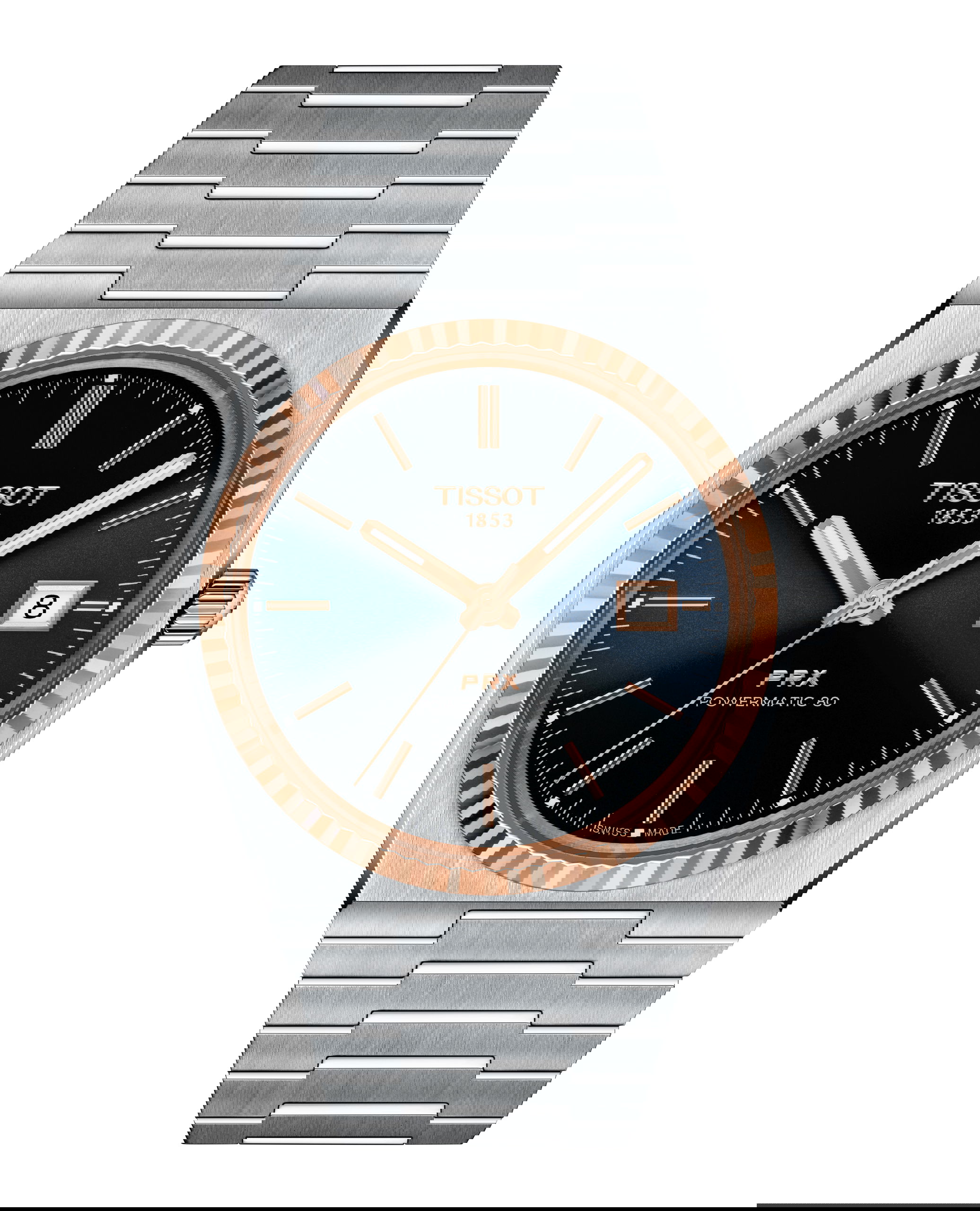 De Tissot PRX Powermatic 80 steel & 18k gold bezel is een modern horloge met een automatisch Zwitsers uurwerk. De Powermatic 80 biedt een gangreserve van 80 uur. Via de achter deksel is het mechanische uurwerk zichtbaar. Het horloge is gemaakt van roestvrijstaal met een roségouden lunette van 18 karaats goud rondom het glas, heeft een doorsnee van 40mm en is voorzien van een krasbestendig saffierglas met antireflecterende coating. De combinatie van de donkerblauwe sunburst wijzerplaat en de stalen band maken het horloge af en geven het horloge een stijlvolle én sportieve uitstraling.