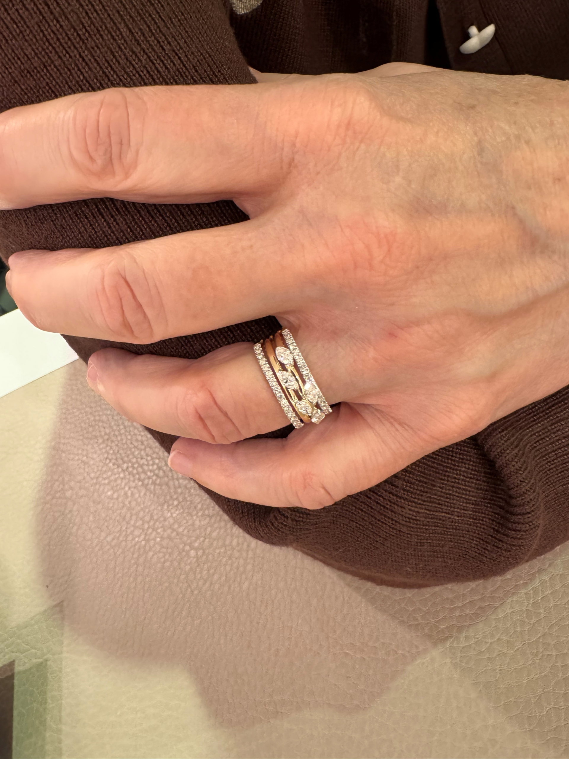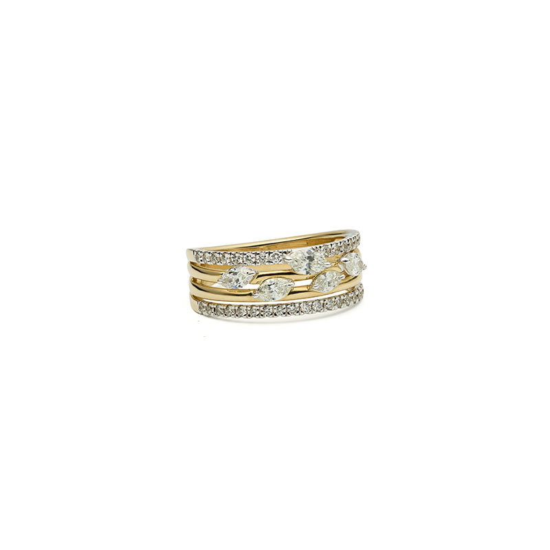 Het toppertje onder de Lustrum ringen met haar 5 blaadjes Marquise geslepen diamanten. De Marquise slijpvorm in de vorm van het blaadje, dat symbool staat voor het 5 jarig jubileum van Katinka Berretty Jewelry. Een wit- met geelgouden ring waarvan het diamant in het witgoud gezet is met in totaal 0.95ct flonkerende diamanten. TW/SI.