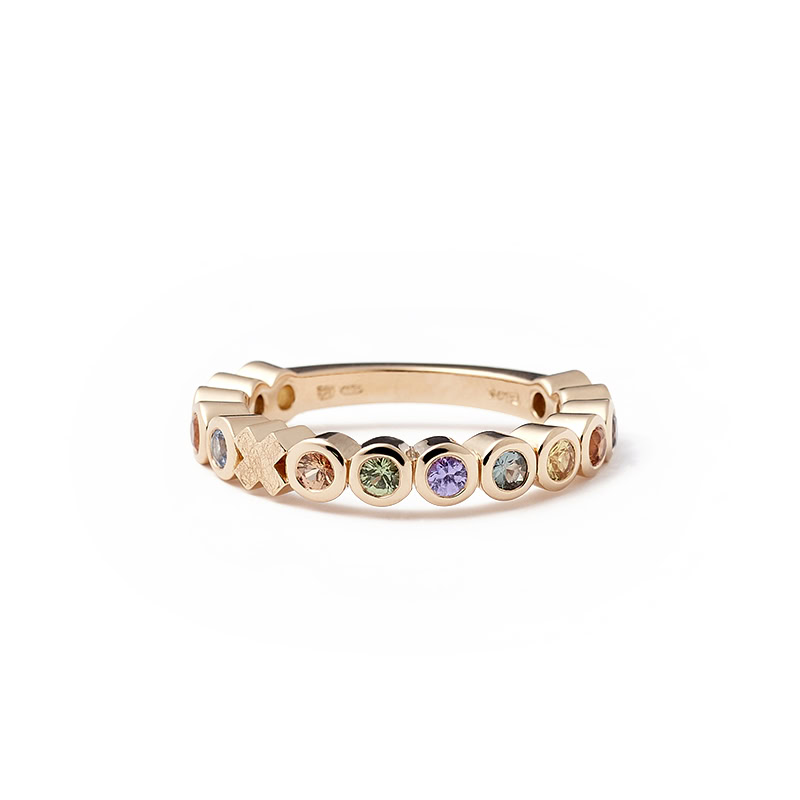 Deze exclusieve Jheronimus Bosch Confetti ring van Bron Jewelry is alleen te koop bij Juwelier Ton van Grinsven in Den Bosch. In samenwerking met Bron is deze ring ontworpen. In 2016 stonden we in Den Bosch stil bij de 500ste sterfdag van kunstschilder Jheronimus Bosch. De kleurrijke saffieren in deze ring zijn geïnspireerd op zijn beroemde drieluik De Hooiwagen. De 18 karaats gouden confetti ring is er in de smalle en de brede uitvoering en als smalle confetti met het x-je. De variant die u nu bekijkt is de smalle variant met het x-je. Ook verkrijgbaar in geel- en witgoud. Neem contact met ons op voor de mogelijkheden.