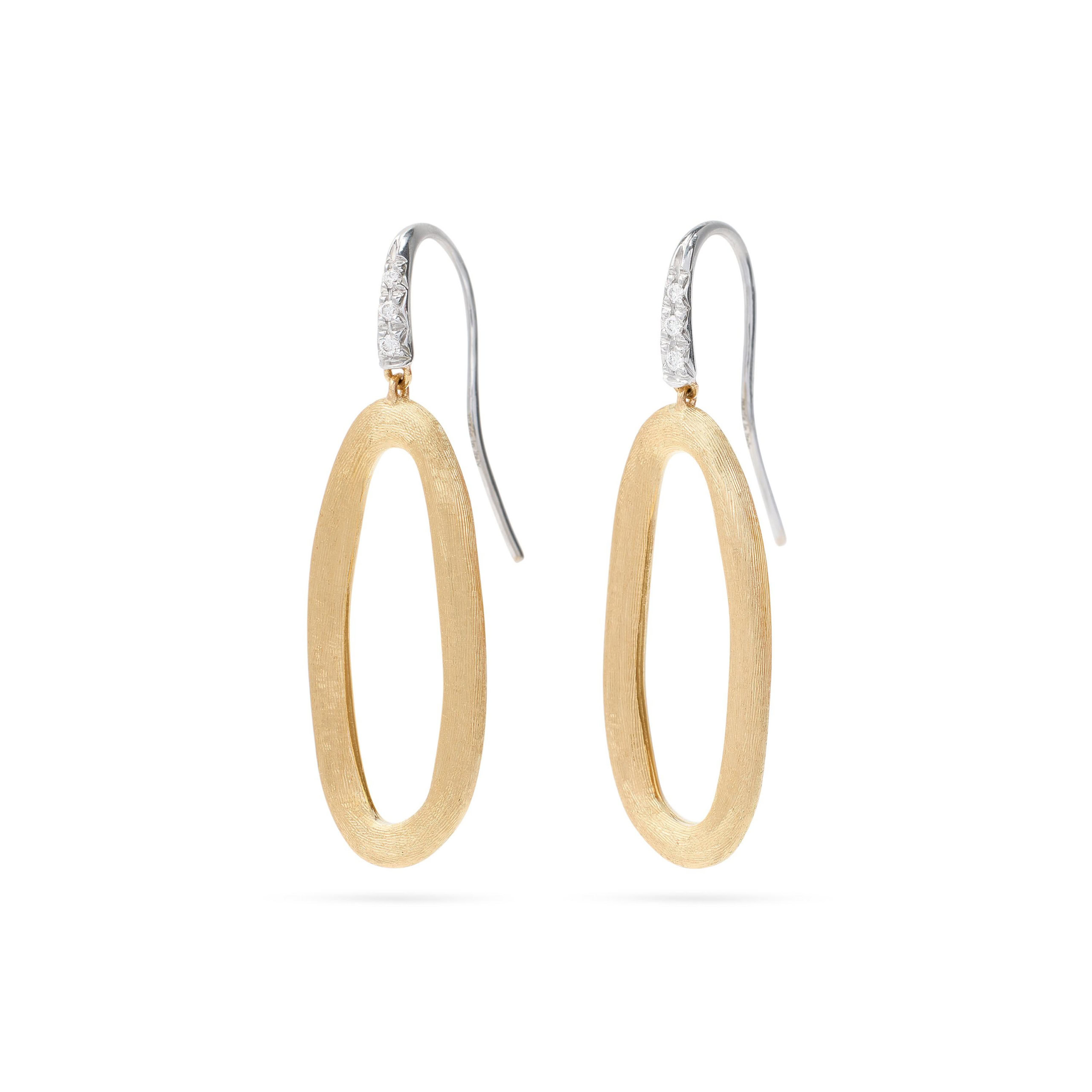 Deze subtiele en eigentijdse Jaipur Link oorhangers van Marco Bicego zijn gemaakt van 18 karaats geelgoud. Het geelgoud is afgewerkt met de Florentine graveertechniek voor de kenmerkende matte afwerking. Deze bewerking wordt door de goudsmeden van Marco Bicego met de hand aangebracht in de sieraden. De oorsieraden zijn afgemaakt met een fraai en delicaat witgouden diamanten pavé haakje (0.05ct TW/VVS) . Deze juwelen zijn niet perfect symetrisch, maar juist het organische zorgt voor de klassieke Bicego look.