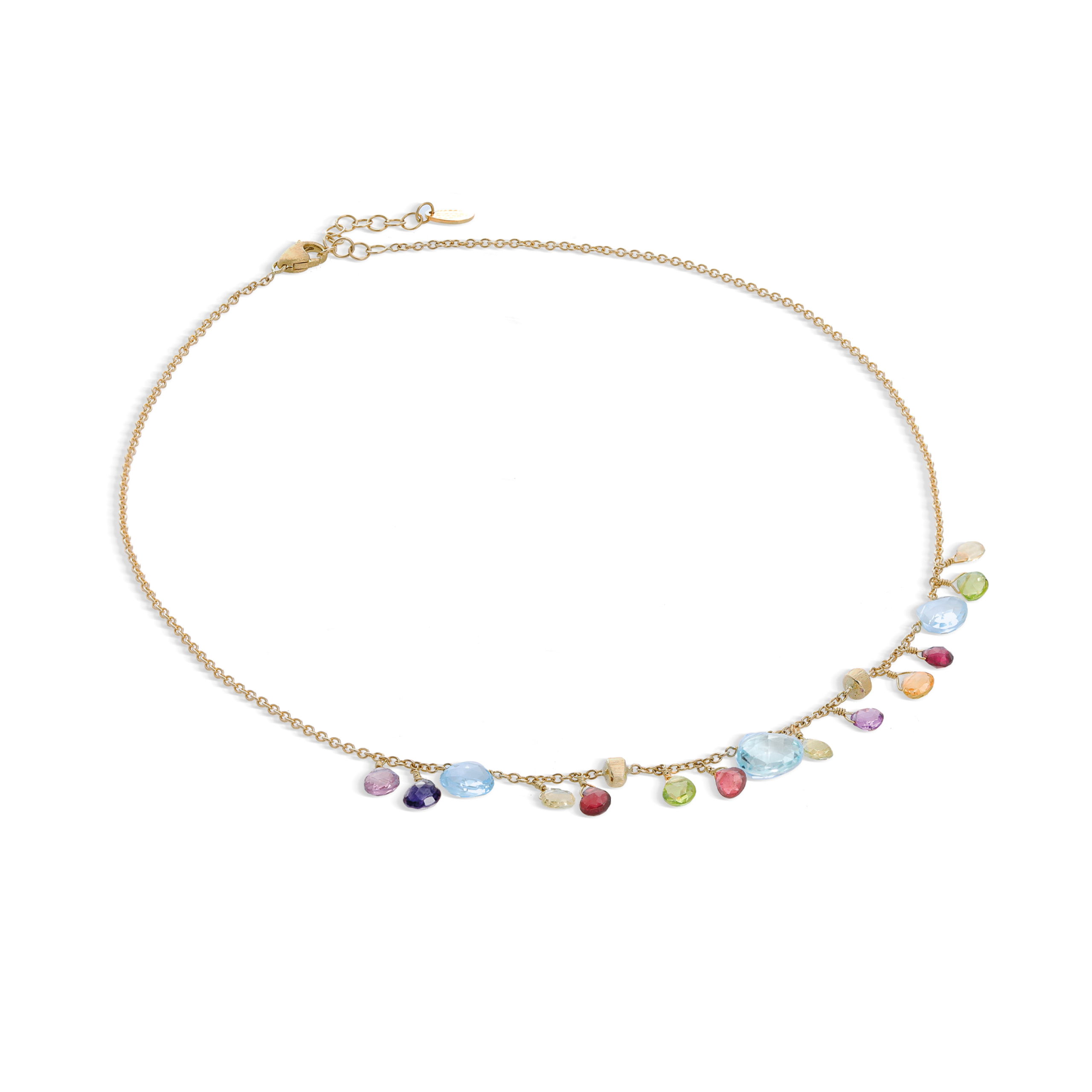 Het Paradise collier van Marco Bicego is een elegant 18 karaats geelgouden ankercollier met diverse kleurrijke edelstenen die aan het collier hangen. Edelstenen die voor dit collier gebruikt worden zijn onder andere blauw topaas, lemon kwarts, roze- en groene toermalijn, london blue topaas, amethyst en citrien. De kleurstenen hangen speels aan het collier wat zorgt voor een vrolijk én elegant effect. Tussen de edelstenen zijn enkele gouden ornamenten toegevoegd die zijn gegraveerd met de eeuwenoude Florentine graveertechniek wat zorgt voor de kenmerkende matte afwerking waar Marco Bicego bekend om staat. Het collier is te dragen op een lengte van 42cm.